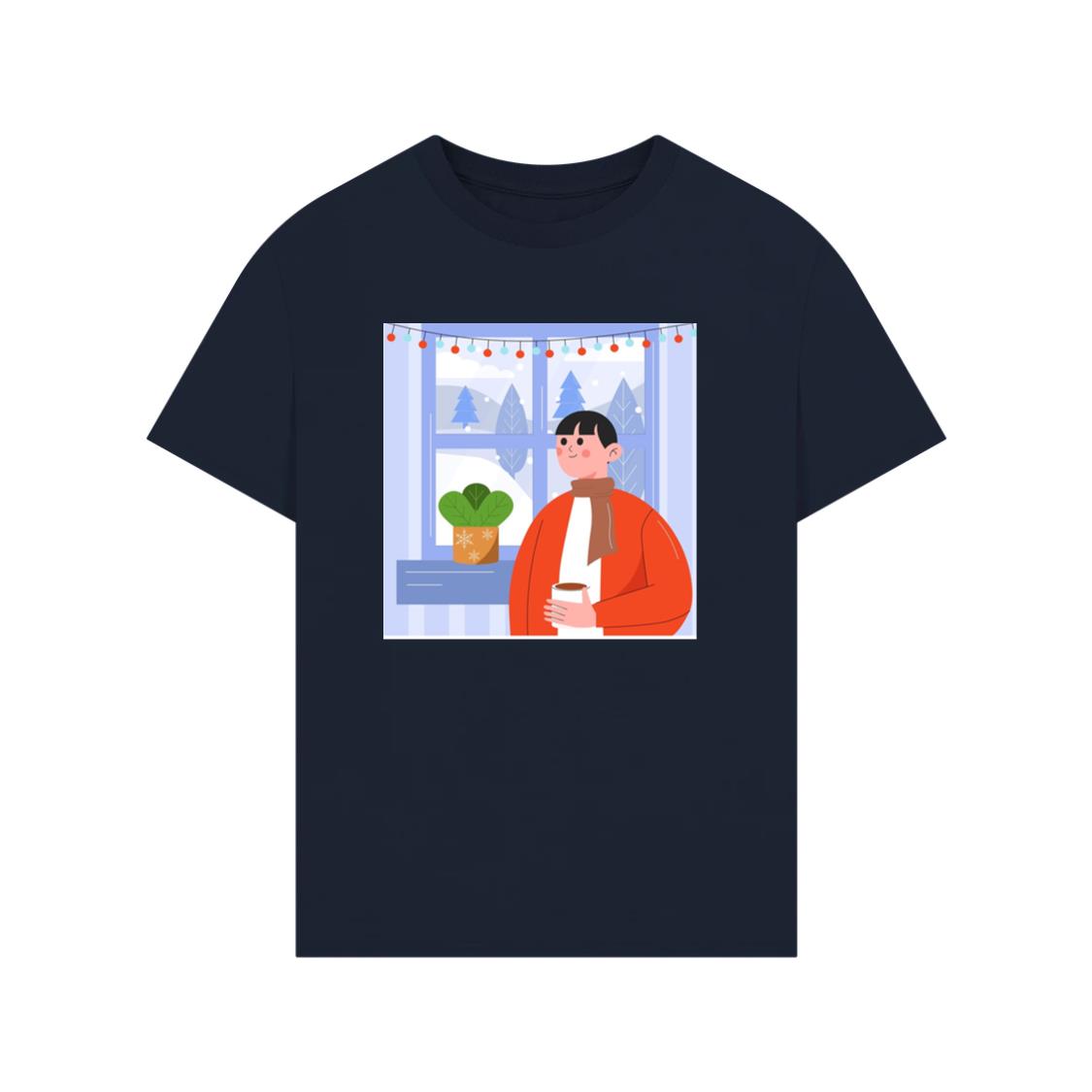 • A Person Enjoys a Drink by a Window with a Snowy View and Festive Lights T-Shirt